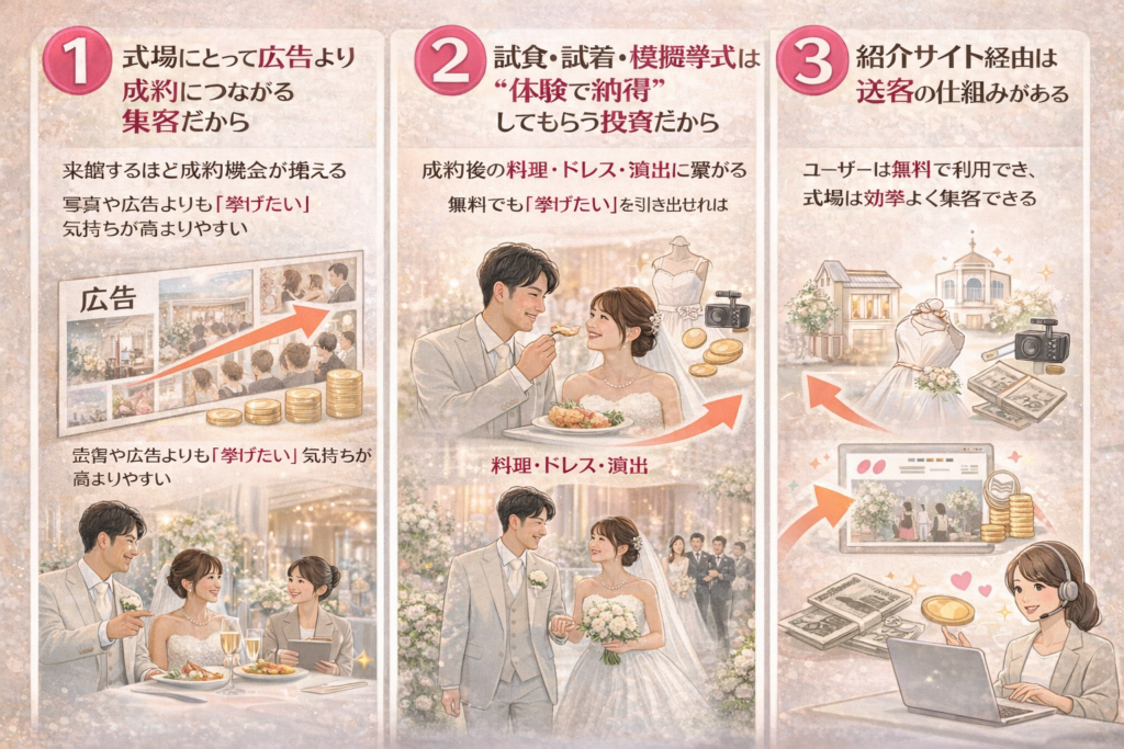 会場見学は「挙げたい気持ち」が高まりやすく、写真や広告よりも成約に近い導線です。無料でも採算が合うのは、来館が増えるほど成約機会が増えるためです。